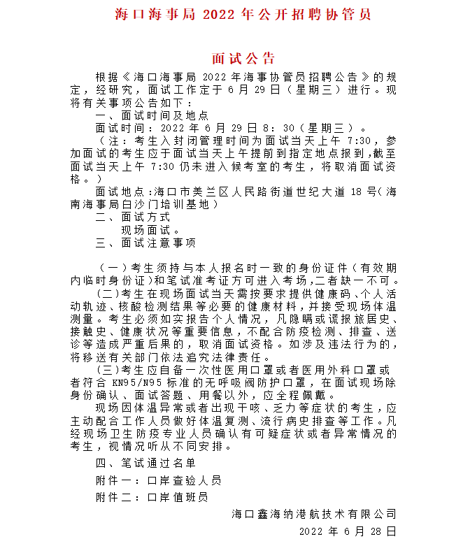 ??诤J戮?022年公開招聘協(xié)管員面試公告 根據(jù)《??诤J戮?022年海事協(xié)管員招聘公告》的規(guī)定,經(jīng)研究,面試工作定于6月29日(星期三)進(jìn)行?,F(xiàn)將有關(guān)事項(xiàng)公告如下:一、面試時間及...2022-06-28點(diǎn)擊:65 -