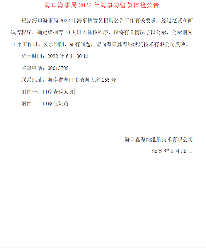 ??诤J戮?022年海事協(xié)管員體檢公告根據(jù)??诤J戮?022年海事協(xié)管員招聘公告工作有關(guān)要求,經(jīng)過筆試和面試等程序,確定梁桐等10人進(jìn)入體檢程序,現(xiàn)將有關(guān)情況予以公示,公示期為1...2022-06-30點(diǎn)擊:25 -