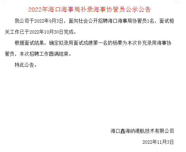 我公司于2022年9月3日,面向社會公開招聘??诤J戮謪f(xié)管員1名,面試相關(guān)工作已于2022年10月30日完成。根據(jù)面試結(jié)果,確定擬錄用面試成績第一名的楊秦為本次補(bǔ)充錄用海事協(xié)管...2022-11-03點(diǎn)擊:47 -